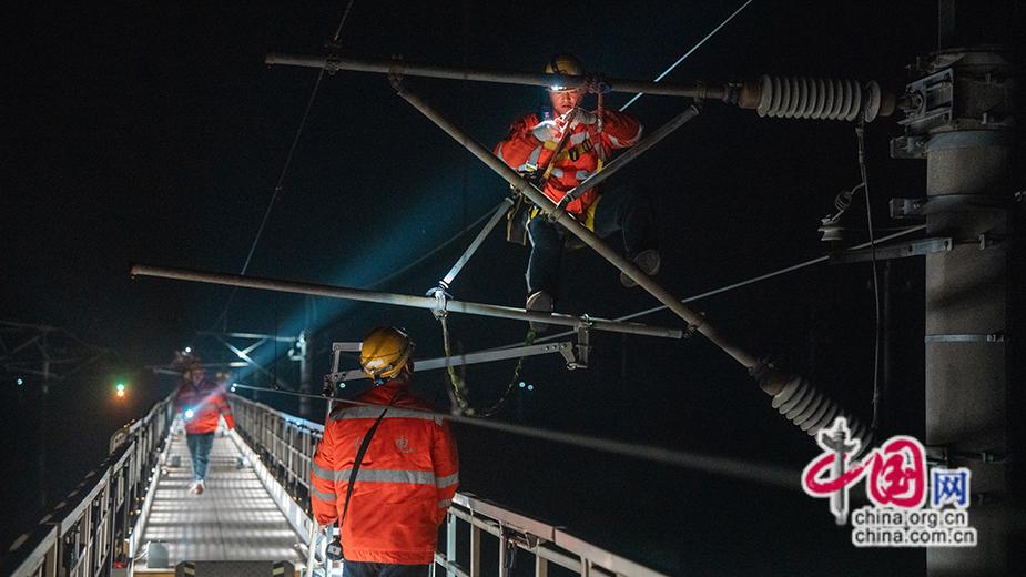 2026年2月10日凌晨,接触网工正在对接触线表面进行检查。徐斌 摄