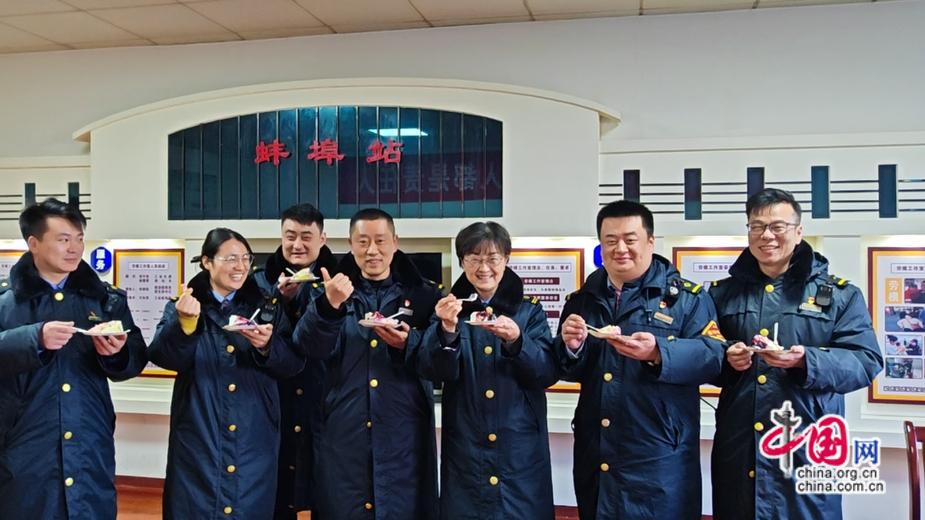 2026年2月17日,蚌埠站值班室内,同事们向临近退休仍坚守岗位的闵红送上生日祝福。 潘馨诺 摄