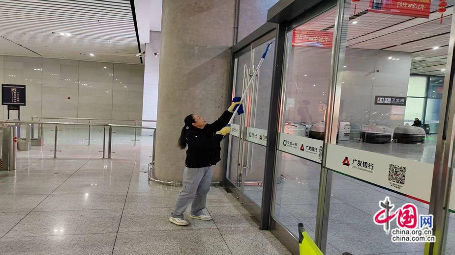 2026年2月11日凌晨,上海华铁旅服有限公司合肥南站分公司高贵琴正在进行日常检查卫生保洁工作。林莞欣 摄