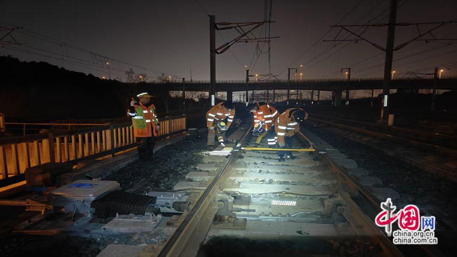 2026年2月11日凌晨,合肥工务段肥东高铁线桥线路工长王朝广在认真检查线路结构及保养。林莞欣 摄