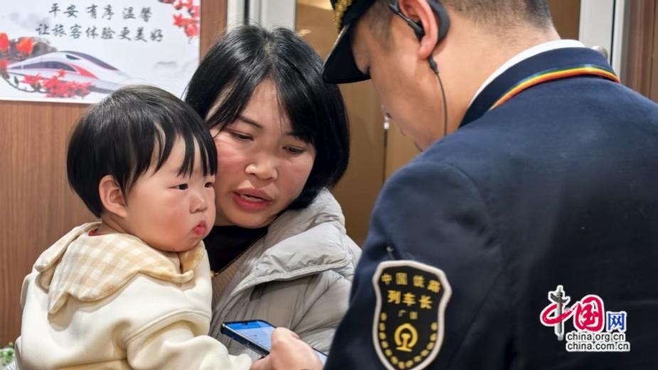 2月24日,G6141次列车上,列车长魏星亮为受伤的小乐乐查询列车到站时刻,并向车站工作人员请求援助。 刘子月 摄