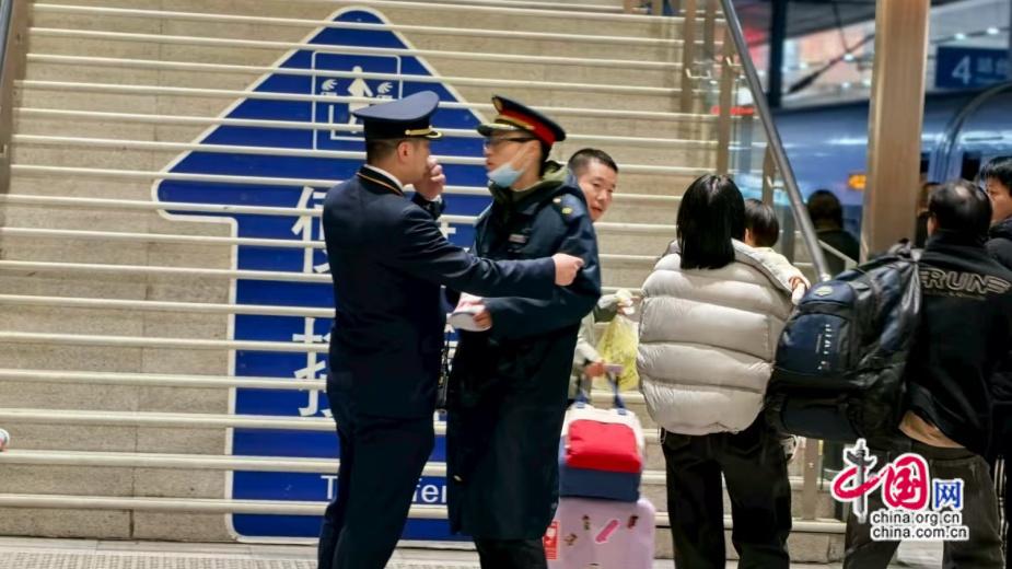 G6141次列车抵达长沙南站,列车长魏星亮与车站工作人员办理交接,协力配合以最快速度帮助小乐乐出站。刘子月 摄