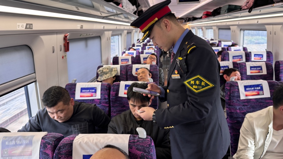 2026年春运期间,张达在车厢内为旅客办理补票。丁雨宸 摄