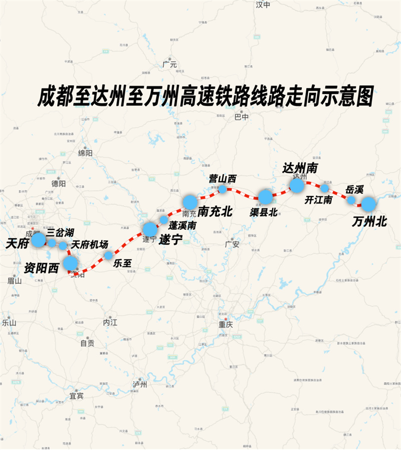 成达万高铁是我国“八纵八横”高铁网沿江通道的重要组成部分。线路西起四川省成都市天府站,途经四川省资阳市、遂宁市、南充市、达州市及重庆市开州区、万州区,接入既有郑渝高铁万州北站,对四川省打通直达长三角、京津冀经济区高速铁路大通道,构建轨道上的成渝地区双城经济圈具有重要意义。