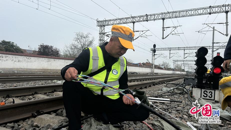 2026年4月7日,陈谊彬在陇海线兴平站大修施工为电缆盒配线。宋亚玲 摄