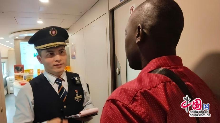 2026年4月15日,中国铁路广州局集团有限公司长沙客运段列车长邓马超在列车上与外籍旅客沟通。曹恒刚 摄