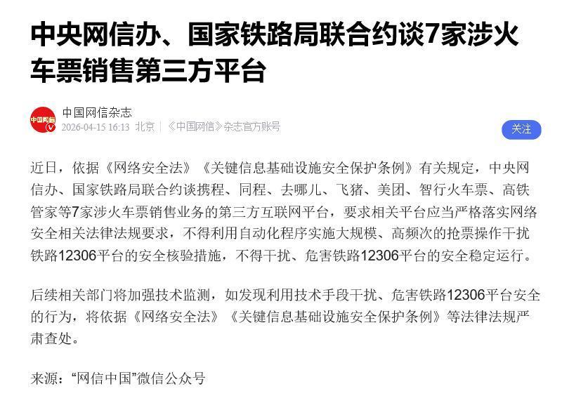 值得一提的是,2026年4月,中央网信办、国家铁路局联合约谈多家平台,要求不得干扰12306系统运行。为何还有这么巨量的恶意抢票请求发送到12306?到底是哪些平台还在顶风作案,需要好好查一查。