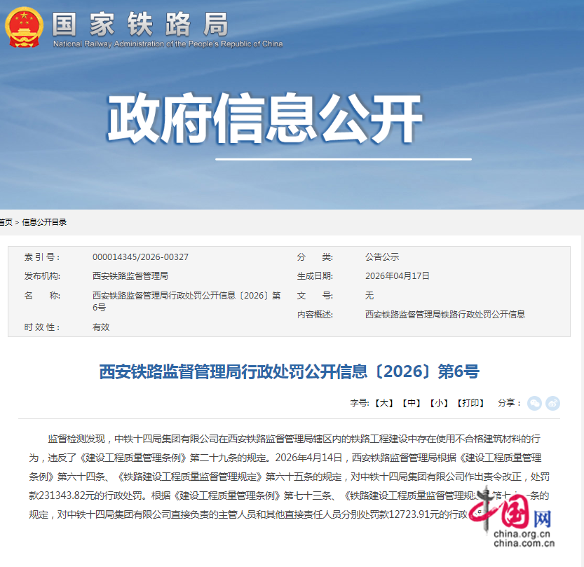 《公开信息》强调,2026年4月14日,西安铁路监督管理局根据《建设工程质量管理条例》第六十四条、《铁路建设工程质量监督管理规定》第六十五条的规定,对中铁十四局集团有限公司作出责令改正,处罚款231343.82元的行政处罚。