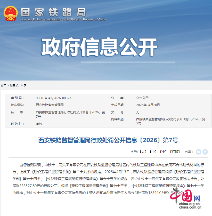 《公开信息》强调,2026年4月13日,西安铁路监督管理局根据《建设工程质量管理条例》第六十四条、《铁路建设工程质量监督管理规定》第六十五条的规定,责令中铁十一局集团有限公司改正违法行为,处罚款333527.80元的行政处罚。
